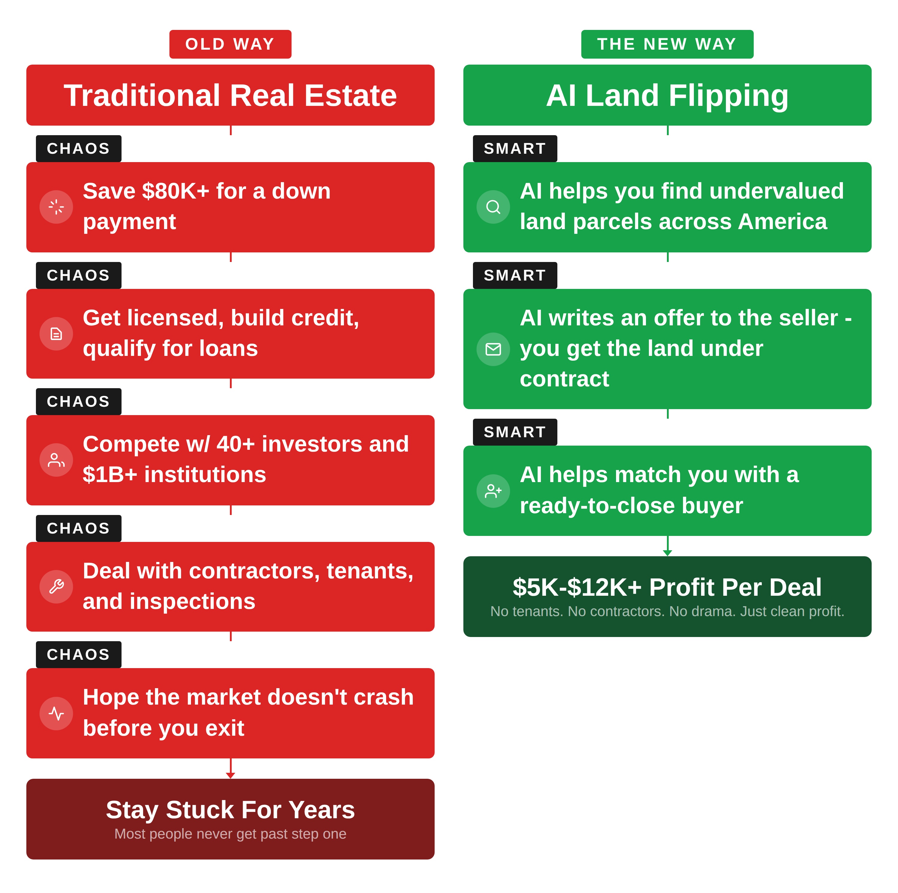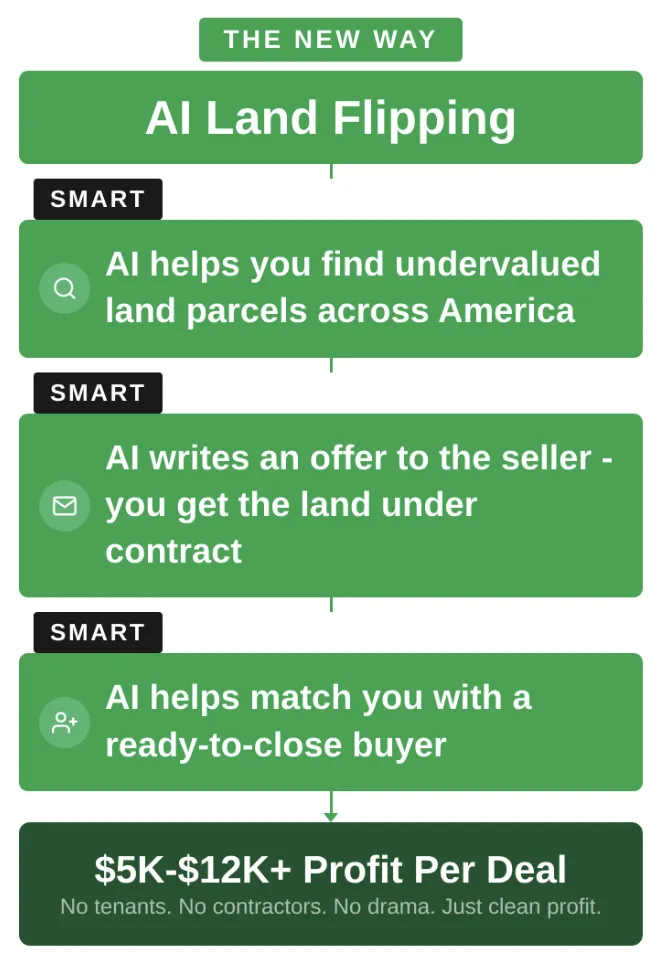 AI Land Flipping is a real estate model where you find motivated landowners willing to sell vacant land at 30-50% below market value, get it under contract, and flip it to a cash buyer at full market price. AI helps speed up the process by assisting with county research, land valuation, and buyer matching. No mortgage, no tenants, no license required. We target a minimum 3X ROI per deal, typically within 60-90 days.