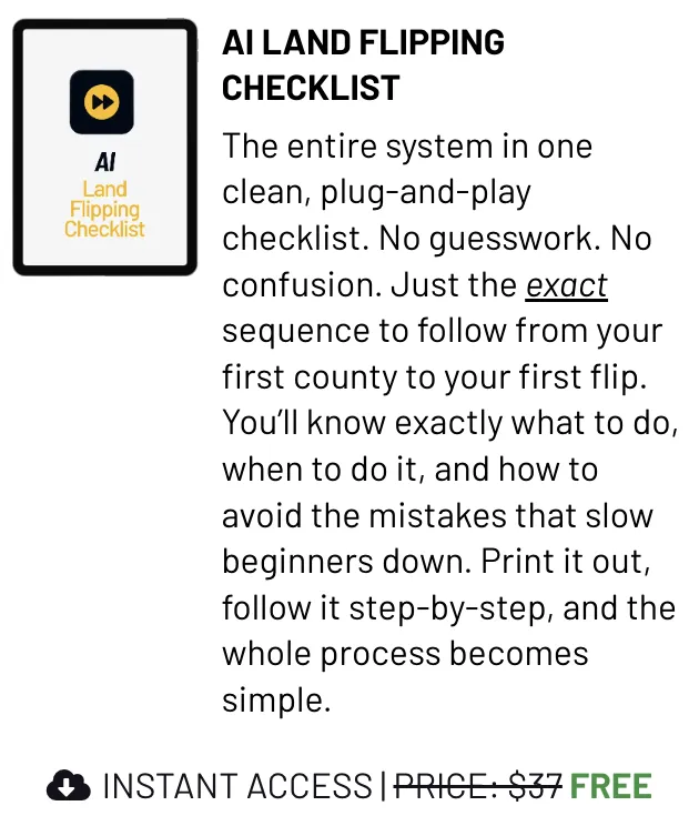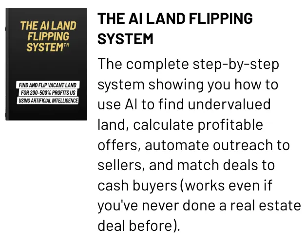 You are getting instant access to the AI Land Flipping Masterclass. Inside, we walk you through the step-by-step process to find undervalued vacant land, get it under contract, and flip it to cash buyers for a minimum 3X ROI per deal. You'll learn how AI can help speed up the deal sourcing, land analysis, and buyer matching process.