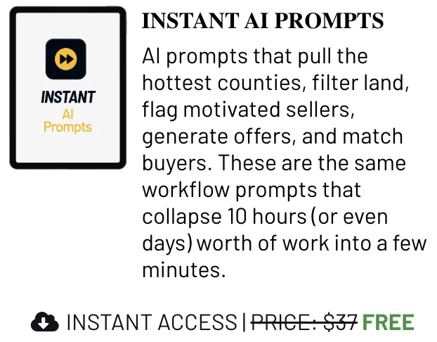 Copy-paste AI prompts that pull the hottest counties, filter land, flag motivated sellers, generate offers, and match buyers. The same workflow prompts that collapse 10 hours of work into a few minutes.