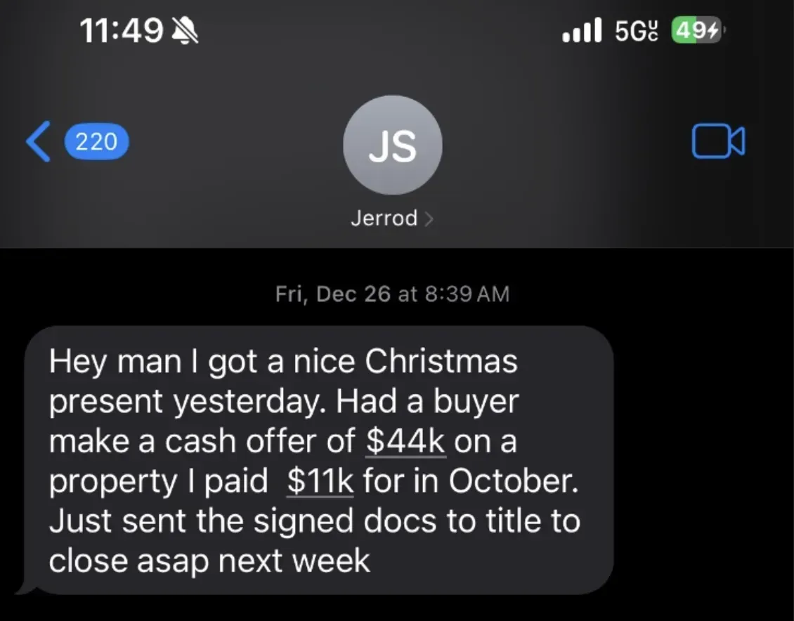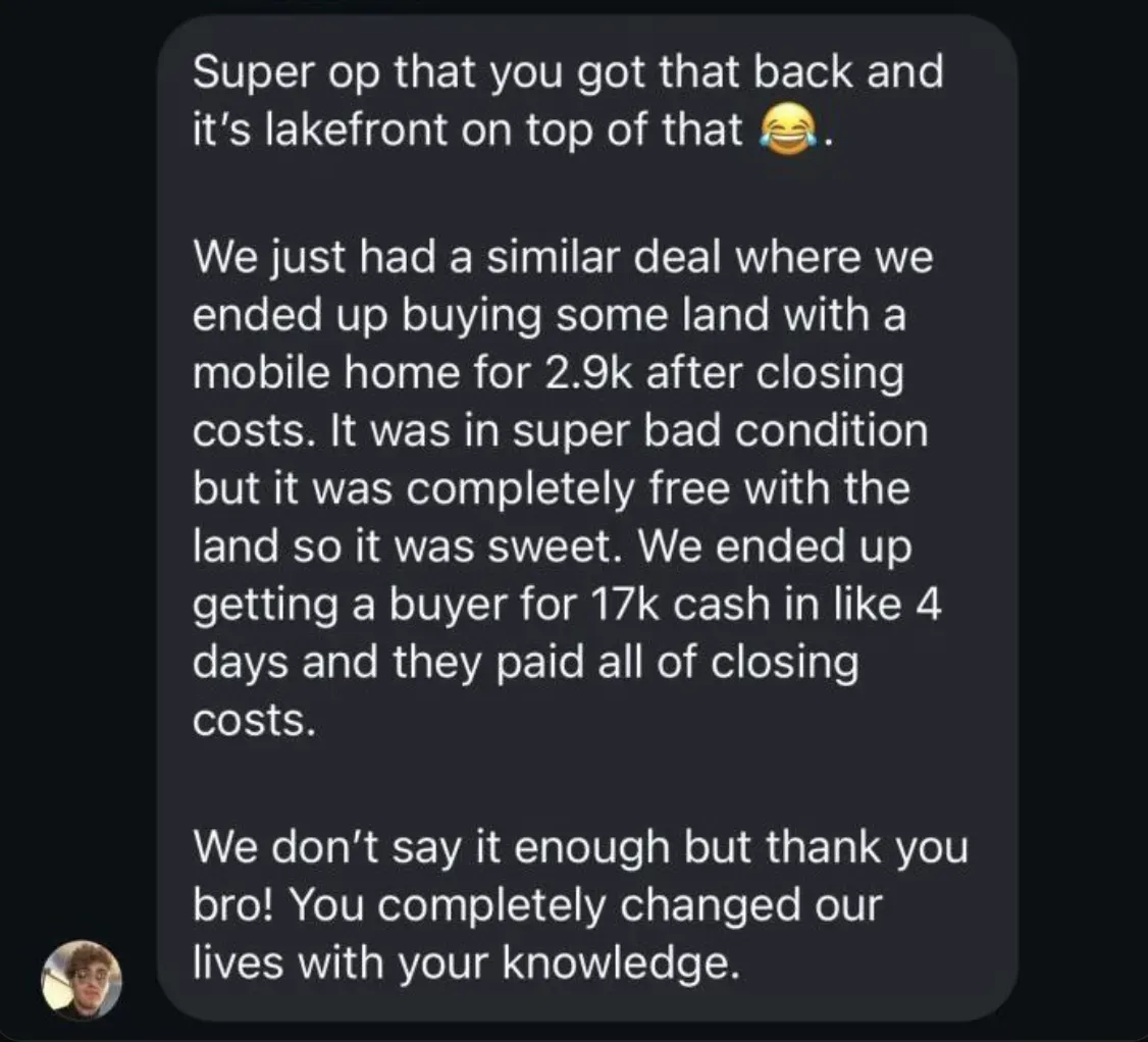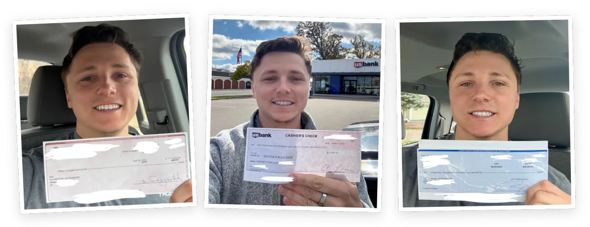 It works. Hunter has personally done over 100 land deals a year and has coached students like Andy (six figures in under 6 months), Andrew (8 deals in 7 months), and Frankie ($50-60K/month in profit). The other thing people love is that you don't need a massive budget to start. There are no mortgages, no down payments, and no bank approvals required. You can get started with minimal capital and scale from there.